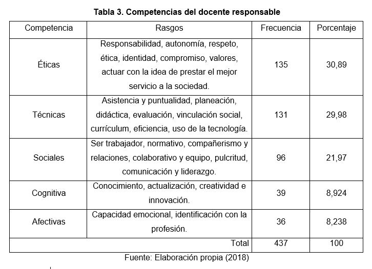 El trabajo de Salazar et al. (2016), tuvo como propósito analizar las competencias docentes de los académicos de la Universidad del Bío-Bío - Chile, desde la perspectiva académica y estudiantil. El resultado evidencia que de acuerdo con la opinión de estudiantes que contestaron la encuesta la responsabilidad es la quinta competencia más importante que debe poseer el cuerpo docente, por encima de actividades como planificar e incluso la transmisión de conocimientos. Sin embargo, de acuerdo con el profesorado, la responsabilidad ocupa el primer lugar. Esta se entiende como el compromiso con el cumplimiento y preparación para la ejecución de una actividad y la preocupación por la formación de valores.