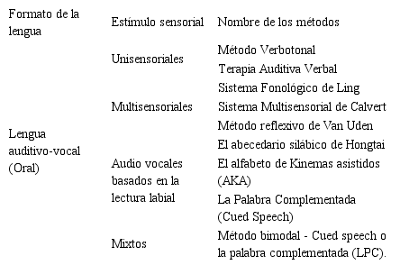 Cuando se privilegian, en diferentes niveles, los métodos comunicativos se promueven, a su vez, espacios en la escuela para las terapias orientadas a niñas y niños en el uso de un sistema lingüístico oral de forma temprana. Un resumen de los Métodos comunicativos más utilizados en la educación de las y los estudiantes Sordos que privilegian la lengua oral, o auditivo-vocal, se presenta en la Tabla 1.