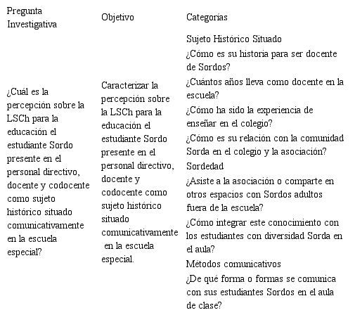 La descripción de los resultados muestra la mirada sobre la lengua de señas chilena presente en la directiva, el docente y la codocente como sujetos históricos situados comunicativamente en la escuela especial a partir de su proceso histórico comunicativo; los métodos comunicativos utilizados en la educación del y la estudiante Sordo, ya sean el Oral, Bimodal y la lengua de señas; y su relación con la Sordedad o la cultura Sorda.