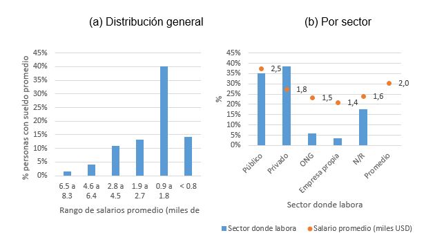 Los salarios promedio son más competitivos en el sector público, a pesar de que en este sector trabaja una menor cantidad relativa de personas en relación con el total de entrevistados. El 35% labora para instituciones gubernamentales, cerca del 38% lo hace para empresas privadas, mientras que el 6% está vinculado a organizaciones sin fines de lucro y únicamente 4 personas (3%) indican tener una empresa propia tipo consultora. El promedio de los salarios de los entrevistados ronda los $1.850 (USD) por mes, la mayoría (40%) gana entre $ 924 y $1.850 mensuales, el 30% de los entrevistados tienen salarios superiores que van desde $1.850 y hasta los $8.323 por mes. En el sector público los salarios promedio rondan $2.400, posiblemente la base salarial se incrementa con pluses como dedicación exclusiva, anualidades, entre otros. En contraposición, en el sector privado el sueldo medio está cercano al $1.850 por mes. El Gráfico 2 muestra los salarios promedio generales y los que se registran por sector de las y los estudiantes del posgrado.
