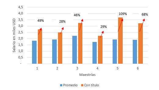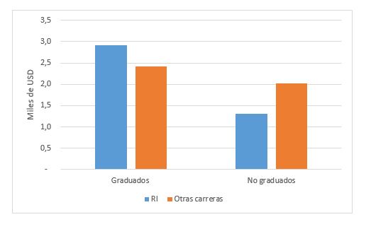 Sin embargo, las personas de otras carreras que no concluyen el posgrado tienen mejor salario que profesionales en relaciones internacionales en igual condición. Las personas con otra formación base obtienen, en promedio, 54% más que los internacionalistas que no concluyen el posgrado. El Gráfico 4 muestra las diferencias salariales promedio entre los graduados y no graduados que tienen como formación base las relaciones internacionales y otras especialidades.