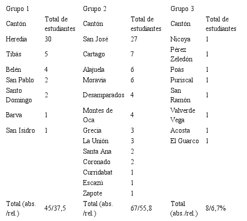 El alumnado que habita en la Gran Área Metropolitana (GAM) reside mayoritariamente en los cantones de Heredia y San José (Ver Tabla 1).