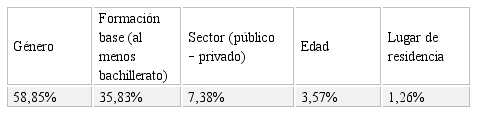 En el caso de las personas graduadas, se calculó el coeficiente de correlación de Person, el cual permite determinar la significancia y el peso estadístico de cinco factores: el género, la formación base, el sector laboral (público o privado), la edad y el lugar de residencia. El modelo compara los cinco factores y asigna un peso estadístico a cada uno de ellos, excluyendo de la muestra para este ejercicio aquellos casos que se encuentran actualmente con el programa en curso (ver Tabla 2).