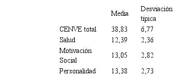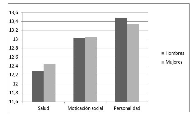 Si se indaga un poco más y se analiza las diferencias entre hombres y mujeres tanto en CENVE total (t (76) = -,017 = p=,986) como en las subescalas que lo componen (salud, t (76) = -,273 = p=,785; motivación social, t (76) = -,032 = p=,974; personalidad, t (76) = ,226 = p=,822) se observa que no existen diferencias significativas entre ellos. En la Figura 2 pueden notarse las puntuaciones obtenidas para cada una de las subescalas. Tal y como puede verse, la única dimensión en la que no se presentan estereotipos negativos es salud, en la que la media de hombres es de 12,29 (DT= 2,14) y la de mujeres 12,45 (DT= 2,49), no obstante, puede verse cómo es en el grupo de mujeres donde las puntuaciones son más altas. Por lo que respecta a las puntuaciones totales la media para hombres de 38,81 (DT=5.62) y 38,84 (DT=7,36) para mujeres, mostrando estereotipos negativos en ambos casos.