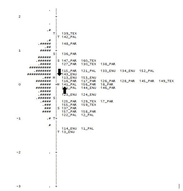 En la Figura 1, la parte izquierda corresponde a los niveles de comprensión lectora estimados para quienes ejecutaron la prueba (cada símbolo # representa a 2 estudiantes y cada punto, a 1 estudiante). Por otra parte, en la zona derecha de dicha figura se representan los niveles de dificultad de los 44 ítems. Como se puede observar, los niveles de dificultad de los ítems y los de habilidad del estudiantado corresponden prácticamente al mismo rango de la escala (desde -2 a 2). Asimismo, las medias de la habilidad del alumnado (M = 0,0) y de dificultad de los ítems (M = 0,00), las cuales se indican con las flechas negras en la Figura 1, están muy cerca entre sí. En este sentido, se puede observar que la prueba no resultó ser ni demasiado fácil ni demasiado difícil para el estudiantado, lo cual implica que los ítems son apropiados para esta población.