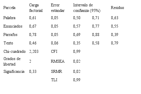En la Tabla 3 se muestran los resultados del análisis factorial confirmatorio, el cual se estimó mediante el método de Máxima verosimilitud y permitió a poner a prueba la bondad de ajuste del modelo unidimensional que sustentó teóricamente la elaboración de los ítems. Este análisis se ejecutó con parcelas de ítems, las cuales se conformaron de acuerdo con los niveles textuales que se pretendía medir con los ítems. De esta manera, cada una de las parcelas corresponde a la suma de las puntuaciones obtenidas en los ítems respectivos. Así pues, 8 ítems pertenecen a la parcela Palabra, 10 a Enunciados, 20 a Párrafos y 6 a la parcela Texto.