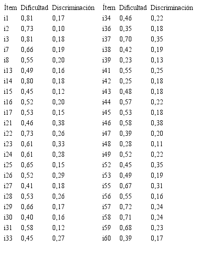 En la Tabla 4 se muestran los ítems que obtuvieron índices de discriminación superiores a 0,10. En este sentido, 16 de los 60 ítems (4, 5, 6, 9, 10, 11, 12, 18, 19, 20, 32, 35, 40, 50, 51 y 54) fueron eliminados en esta etapa y no se incluyen en los análisis posteriores. Asimismo, en lo que respecta a la puntuación total obtenida a partir de la sumatoria de las respuestas correctas en estos 44 ítems, esta osciló entre 0 y 39 respuestas correctas, con una media de 23,95, una desviación estándar de 6,05 y una mediana de 25.