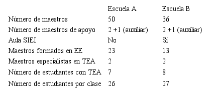 En la escuela A, el SIEI efectuaba el apoyo en el aula regular. De los 50 maestros de los que dispone la escuela, dos ejercían el rol de maestro de apoyo. Ambos tenían formación específica en Educación Especial (EE) y en TEA.