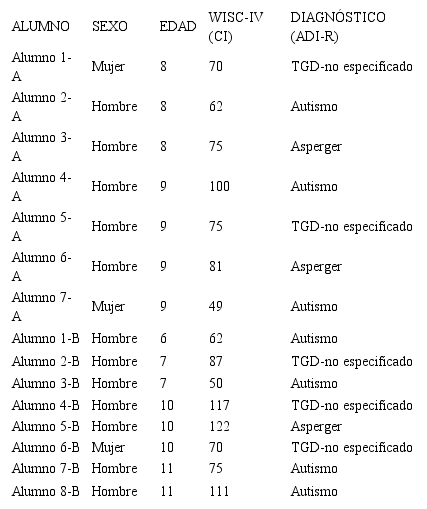 En total, 15 estudiantes participaron en el estudio (12 niños y 3 niñas) entre 6 y 11 años. Se requirió el consentimiento de los padres para su participación. Todos asistían a la clase regular que les correspondía según su edad y tres de ellos en el aula SIEI. Según el ADI-R, de Le Couteur, Lord y Rutter (2006), estos alumnos tenían el diagnóstico dentro del espectro autista y, según el WISC-IV de Wechsler (2005), su coeficiente intelectual oscilaba entre 49 y 122 (ver Tabla 2).