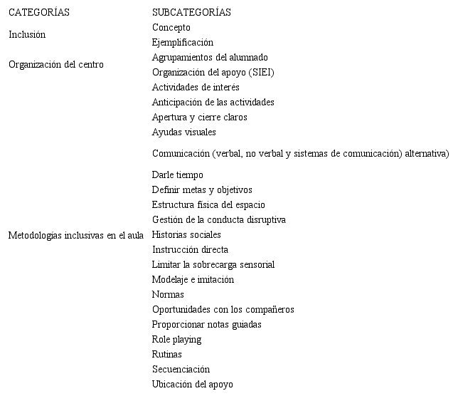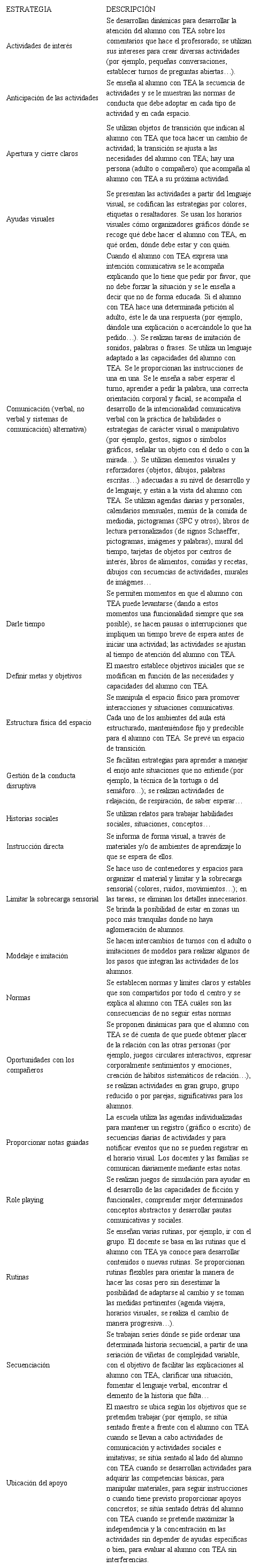 Las estrategias metodológicas más comúnmente recomendadas para trabajar con alumnado con TEA pretenden favorecer la contextualización y concreción de la información y del conocimiento: utilizar una apertura y un cierre claros, enseñar de manera secuencial y progresiva, dar ejemplos, explicar el significado de las metáforas, proporcionar notas guiadas, proponer actividades que se puedan generalizar y facilitar múltiples oportunidades tanto de aprendizaje como de evaluación, según afirman Krasny, Williams, Provencal y Ozonoff ( 2003) y Anderson (2007), así como definir claramente las expectativas que se tienen sobre el alumnado, utilizar un lenguaje concreto, con instrucciones explícitas, claras y específicas, además de dar tiempo al alumnado con TEA si este lo requiere, según describen Brown y Coomes (2016). Asimismo, con el objetivo de aumentar la participación activa del alumnado con TEA, se aconseja estructurar las actividades y presentar la información de manera oral con apoyo visual, usando tanto organizadores visuales como físicos, el uso de horarios visuales, según plantean Bryan y Gast (2000), de libros ilustrados tal como afirman Sigmon, Tackett y Price Azano (2016), historias sociales, descritas por Gray (2003), y de nuevas tecnologías, como podría ser el iPad, como describen Brodhead, Courtney y Thaxton (2018), y propiciar las actividades de interés del alumnado con TEA, pues ayudan a evitar el aburrimiento y favorecen la inclusión, según mantienen Lindsay, Proulx, Scott y Thomson (2014). Por otro lado, la anticipación, el refuerzo positivo, los esquemas visuales, las técnicas de autocontrol y el role playing ayudan a prevenir conductas disruptivas, como explican Leach y Duffy (2009), McCurdy y Cole (2014) y Lindsay et al. (2014). Así como definir claramente los espacios de trabajo, limitar de la sobrecarga sensorial, según mantiene Kluth (2003), y establecer normas claras tanto de comportamiento como sociales para todas las rutinas del aula, tal como afirman Goodman y Williams (2007). Finalmente, se recomienda utilizar el Sistema de Comunicación Alternativa, según plantean Bondy y Frost (2002), y la comunicación no verbal, según mantienen Bowe (2004) y Wilmshurst y Brue (2010), con el objetivo de aumentar la capacidad comunicativa del alumnado, además de fomentar la instrucción en grupos pequeños o bien la enseñanza en parejas, basándose en el aprendizaje cooperativo, según describen Kamps et al. (2014).