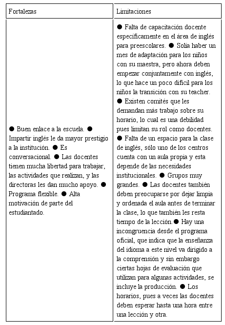 No obstante, a pesar de contar con una visión tan favorable de las partes, se identificaron más limitaciones que aciertos del sistema de enseñanza del idioma inglés a nivel preescolar. Lo anterior, se visualiza en la Tabla 2: