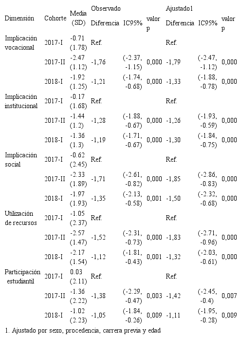 Las diferencias crudas y ajustadas entre las dimensiones por cohorte se muestran en la Tabla 2. Quienes fueron admitidos y admitidas en el segundo semestre del año 2017 (cohorte 2), mostraron los mayores promedios en las cinco dimensiones; la cohorte del primer semestre del año 2017 (cohorte 1) tuvo los menores valores en todos los componentes. Para la comparación, la diferencia de promedios tomó como referencia la cohorte 1; los hallazgos fueron consistentes cuando se ajustó por las variables sociodemográficas.