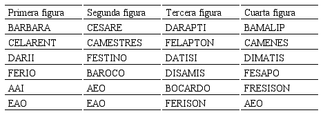 De acuerdo a Bochen´ski: “Los modos a que aquí se alude son estos: Darapti, Felapton, Bamalip, Fesapo y los cinco subalternos: Barbari, Celaront, Cesaro, Camestrop, Calemop”. (Bochen´ski, 1985, p. 382)