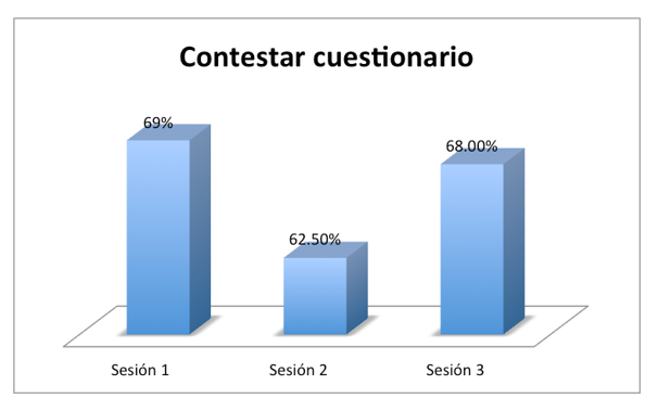 Como se puede observar, el puntaje más alto lo obtiene la primera sesión, con un 69%, le sigue la sesión 3 con un 68%, y finalmente se encuentra la sesión 2 con un 62.05%. Es interesante reflexionar en torno a los resultados, pues la primera sesión resulta ser la que obtiene mayor participación en esta actividad, lo cual refleja el interés del estudiantado por continuar con el proceso de articulación entre ver el video y contestar el cuestionario correspondiente, existe en la segunda sesión una baja considerable que corresponde a 6.5%, la cual se incrementa nuevamente en la tercera sesión con 5%, pero que no alcanza el nivel de respuesta de la primera sesión, entonces, ¿qué tipo de actividades, seguimiento y proceso de mediación se requiere trabajar para que el estudiantado incremente su participación?, otra pregunta también relevante es ¿qué pasa en la tercera sesión que el nivel de participación se incrementa?, ¿cómo lograr que el porcentaje de participación vaya en aumento sesión tras sesión?