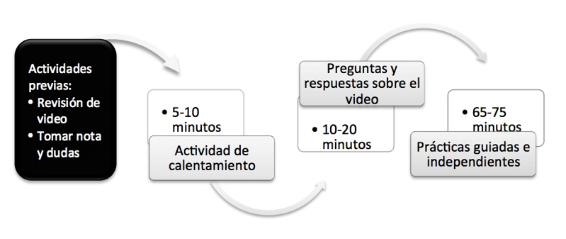 En el caso propio del proyecto de intervención desarrollado, se plantea una secuencia didáctica bajo las necesidades de dicha intervención con el modelo clase invertida, en donde específicamente se incluye el apartado Preparación para la sesión, el cual brinda actividades previas a la sesión, en el que el estudiantado cuenta con videos con clases magistrales grabadas por el profesorado y pequeños cuestionarios para comprobar la revisión de los videos. Estas actividades permiten que el estudiantado llegue al salón de clases con conocimientos previos y teóricos, sobre el tema a abordar, dentro de la sesión presencial, y de esta manera aprovechar el tiempo en actividades prácticas y significativas.