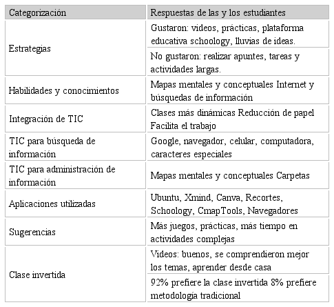 Posterior a eso, en clase se atendieron dudas sobre el contenido de los videos y se llevaron a cabo diversas actividades como prácticas con la computadora, discusiones guiadas y sociodramas, para una mejor comprensión de los temas. Los resultados sobre la percepción de esta nueva forma de aprender, por parte de las y los estudiantes, fue positiva, ya que sus comentarios y disposición dentro del aula permitieron observar motivación en ellos.