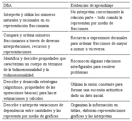 Con los anteriores indicadores se evidenció que las estudiantes proponen patrones de comportamiento numérico y patrones de comportamiento gráfico, ejecutan cálculos numéricos, organizan la información en tablas, elaboran representaciones gráficas y las interpretan, las cuales son competencias básicas que demanda un buen proceso de modelación, sin embargo, no hubo respuestas muy variadas que significaran nuevos abordajes al problema de la Figura 4, esto debido a que las estudiantes se compartieron sus soluciones en algún momento y unas le copiaron las respuestas a las otras. La Tabla 2 muestra algunos Derechos Básicos de Aprendizaje [DBA] (MEN, 2015) en matemáticas y cómo se evidenciaron estos aprendizajes en las estudiantes. DBA se refieren a un conjunto de saberes y habilidades acerca de lo fundamental que cada estudiante debe aprender al finalizar cada asignatura en cada grado escolar, en concordancia con lo establecido en los EBC y en los lineamientos Curriculares (Gómez, Castro, Bulla, Mora y Pinzón, 2016).