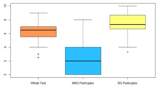 Figure 1 contrasts the results of the entire text, thus revealing that student performance is rather low (M = 6.18, SD = 1.13, n = 61). Based on the results, only half of the population (3rd and 4th quartiles) would obtain the minimum grade to pass the test. But, although the maximum grade was a 9 out of 10, two outliers display results of 2.5 and 3. On the other hand, the lowest results considered NRGs (M = 2.00, SD = 2.33, n = 61) only. Students in the 1st, 2nd, 3rd and even the 4th quartile did not attain a minimum score of 7. The threshold score stands at 8 while 18 students had no correct answers (Mo = 0). When considering account rule-governed participles, results show some improvement (M = 7.33, SD = 1.51, n = 61). In this case, students in the 2nd, 3rd and 4th quartiles would be able to pass the test. The scores range from a maximum of 10 to an outlier of 3.33.