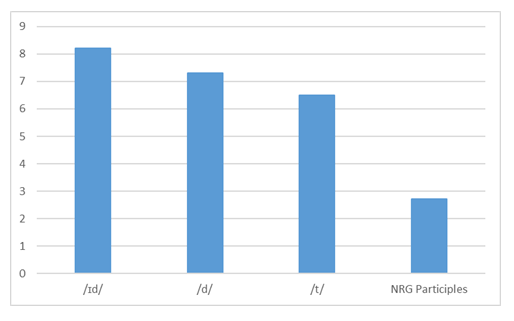 The following analysis of the results presents five types of data. The first corresponds to the results of the test in its entirety and combines NRG (non-rule-governed) participles with RG (rule-governed) participles. A separate analysis will be conducted to measure student scores regarding NRG participles only. The third group of data shows results for RG participles only. The fourth offers a comparison between morphemes /t/, /d/, /ɪd/ and the non-standard pronunciation of participial adjectives ending in -ed. The fifth compares those NRG participles considered to be most difficult for students.