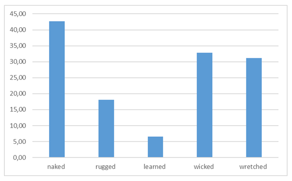 Source: Elaborated by the authorFigure 3 shows the results of the test by NRG words with the percentage of correct responses for each irregular form. In general, the easiest word for students to classify was naked (42.62%), followed by wicked (32,79%), and wretched (31,15%). The words that were most troublesome for students were rugged (18,03%) and learned (6,56%). These results reveal that more than two-thirds of the entire popluatation have trouble pronouncing NRG adjectives.