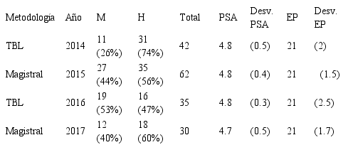 En la Tabla 1 se presenta la información para los años 2014 y 2016, años de aplicación de la metodología TBL, detallando la información por género (M=Mujeres, H=hombres), promedio semestral acumulado (PSA) y Edad Promedio (EP), estas dos últimas junto con sus respectivas desviaciones estándar (Desv.); se presenta adicionalmente la información correspondiente a los años 2015 y 2017 (años sin aplicación de la metodología). En la Tabla 1 se presenta información básica tal como género y edad, e información adicional sobre el promedio semestral acumulado (En escala de 1 a 7). Tal como se puede observar los grupos están constituidos en su mayoría por hombres (lo cual ha sido la tendencia de matrícula en el programa de Ingeniería Civil Química) con excepción del año 2016. En el año 2015 el curso contó con un gran número de estudiantes debido a que en ese año en particular a las/los estudiantes se les brindo de manera excepcional mayor flexibilidad en la cantidad de cursos que podían inscribir. En todos los demás aspectos tales como promedio semestral acumulado y edad, los grupos entre los años 2014 y 2017 son homogéneos no exhibiendo mayores diferencias.