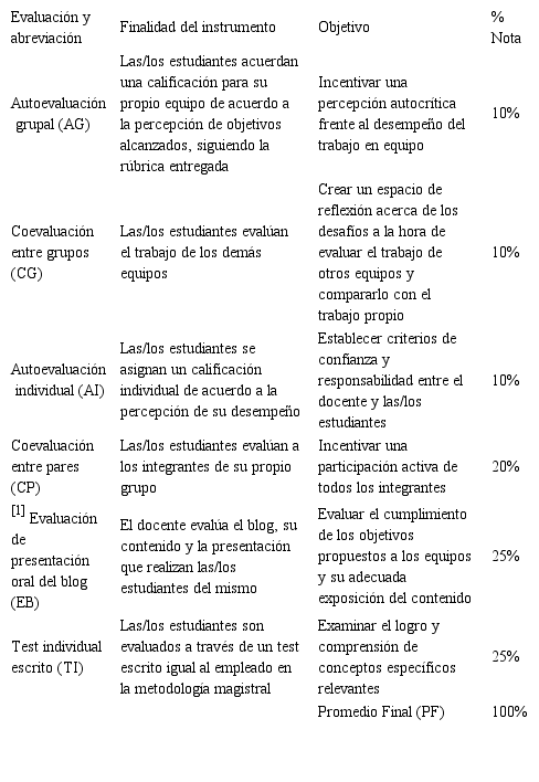 Considerando que la evaluación es parte del desarrollo de competencias, la autoevaluación y la coevaluación son fundamentales para que cada estudiante se responsabilice de su proceso de aprendizaje. En este estudio, en lo referido al diseño pedagógico, se utilizaron: autoevaluaciones y coevaluaciones grupales e individuales, presentación oral del blog, y test individual de conocimientos. El detalle de las evaluaciones y sus ponderaciones se muestran en la Tabla 2.