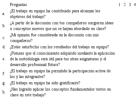 En la Tabla 3 muestra las preguntas del cuestionario para evaluar el grado de satisfacción del estudiantado respecto a la metodología. Esta se compone de ocho reactivos en escala de estimación Likert donde 1: Totalmente en desacuerdo, 2: En desacuerdo, 3: De acuerdo, 4: Totalmente de acuerdo. Fue adaptada a partir de abundante revisión de literatura (Bouw, Gupta y Hincapie, 2015; Branson, Boss y Fowler, 2015; Haidet, Kubitz y McCormack, 2014; Vasan, DeFouw y Compton, 2009) y sometida a revisión por cuatro expertos.