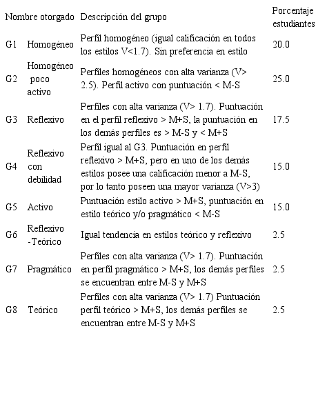 En la Tabla 4 se puede observar los ocho grupos que resultaron, según las puntuaciones alcanzadas en el test de estilos de aprendizaje. Estos grupos fueron la base para conformar los equipos de trabajo de manera heterogénea. Esto permitió que en un solo grupo de trabajo no se concentraran solo integrantes con tendencia prioritaria a un estilo de aprendizaje: activo, pragmático, reflexivo y teórico. Se calcularon las puntuaciones de las/los estudiantes para cada estilo de aprendizaje, y se elaboró un análisis estadístico teniendo en cuenta los siguientes factores estadísticos. M= valor promedio en la puntuación en cada estilo de aprendizaje, S= desviación estándar del valor promedio, V= varianza del valor promedio. Se ejecutó un análisis considerando las puntuaciones de cada estudiante en cada estilo de aprendizaje y su ubicación con respecto a los factores estadísticos descritos anteriormente. Posterior a ello, se identificaron ocho diferentes tendencias resumidas en la Tabla 4.