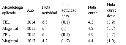 En la Tabla 5, los valores en paréntesis corresponden a las desviaciones estándar. De esta tabla se puede observar de manera más concreta que la metodología permitió obtener mejores notas para la actividad desarrollada con la metodología TBL (6.5 y 6.2) en los años 2014 y 2016, con respecto a las notas de (6.0 y 4.9) alcanzadas para los años 2015 y 2017 respectivamente. Adicionalmente para el año 2016 el curso alcanzo la nota final más alta (4.9) comparada con los demás años donde la misma nota fue ≥4.8; y aunque no se alcanza a percibir una clara correlación entre el uso de la metodología y las notas finales del curso, si se puede evidenciar por parte de las/los estudiantes una mejor disposición al aprendizaje, tal como se evidencia en la siguiente sección.