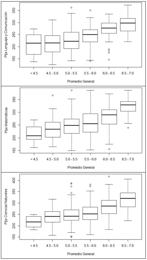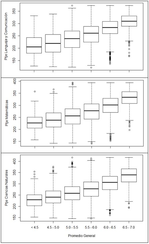 Al analizar las tres pruebas SIMCE y su relación con las notas de colegio, consolidando todos los colegios de la ciudad de Temuco, se observa que para todas las pruebas en los rangos de notas 5,0 y 6,5 se encuentran las mayores dispersiones en puntajes (Figura 2).