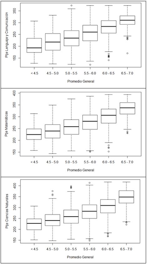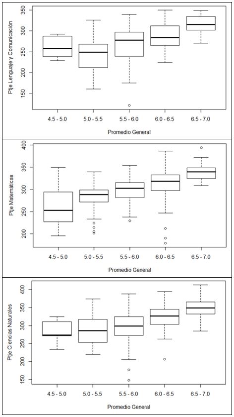 Para la representación gráfica de la relación entre el promedio general notas y el puntaje de las pruebas SIMCE, se construyeron gráficos de cajas o diagrama de Tukey (Kloke y Mckean, 2015), para diferentes rangos de notas, con una amplitud de clase de 0,5 puntos.