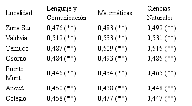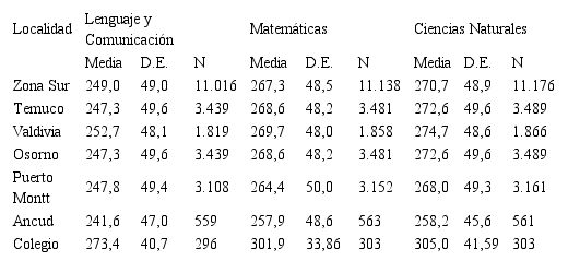 Fuente: Elaboración propiaAl desarrollarse un análisis macro a nivel de la zona sur, se obtienen correlaciones bajas entre el promedio de notas y los puntajes para cada una de las pruebas, situación similar ocurre a nivel de ciudad e incluso considerando solo un colegio en particular (Tabla 1), a pesar de que este último si tiene promedios de puntajes más altos en las tres pruebas, esto es, el colegio seleccionado con el 2.7% de representación sobre el total del Sur de Chile, obtiene promedios superiores en 24 puntos en LC, 34 puntos en M y 34 en CN (Tabla 2). Para efecto de revelar de manera más clara las inconsistencias entre el rendimiento del estudiantado en el colegio y los resultados obtenidos del examen de la prueba SIMCE, es recomendable elaborar un análisis correlacional entre notas de enseñanza media y los resultados de la prueba SIMCE a nivel de colegio y no agrupados por ciudades, regiones o país.