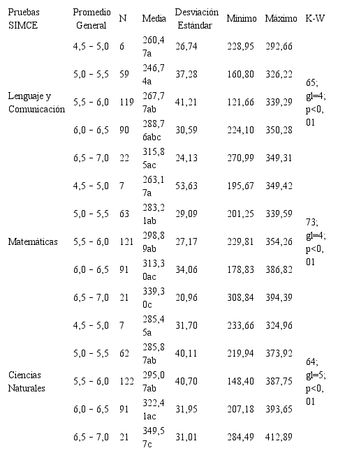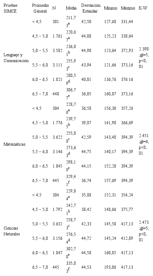 Al ejecutar un análisis comparativo a nivel de puntajes medios de las pruebas SIMCE y para cada uno de los rangos de notas, todos presentan diferencias significativas excepto en LyC para los rangos de notas < 4,5 y 4,5 – 5,0, sin embargo, el análisis de correlación per se efectuado (Tabla 1), invisibiliza la variabilidad de puntajes SIMCE para estudiantes que demuestran el mismo rendimiento en el colegio (Tabla 3). Esta inconsistencia apoya las críticas respecto a la validez de la prueba SIMCE para medir aprendizajes, pues la otra interpretación posible para ello, es que la calificación del profesorado estuviera errada, opción menos aceptable dado que implicaría una deficiencia a nivel docente en todo el país.