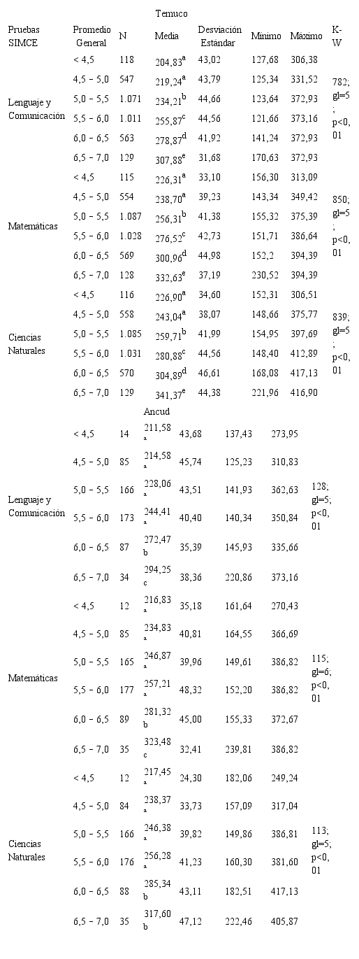 Fuente: Elaboración propiaEn el caso de Temuco, el análisis comparativo a nivel medias de los puntajes en todos los rangos de notas muestra que solo los dos más bajos no presentan diferencias estadísticamente significativas en ninguna de las tres pruebas (Tabla 4, Temuco). Se justificaría así, la separación que se hizo al analizar la muestra por el número de colegios en cada una de ellas, dado que en 344 colegios de la Zona Sur se enmascara con mayor facilidad el comportamiento de los puntajes SIMCE respecto a 100 colegios de Temuco y las respectivas notas obtenidas por el alumnado en sus colegios.