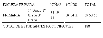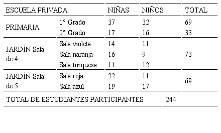 En el año 2017, en la escuela privada, participaron 188 niños y niñas de 1°, 2° y 3° grado (Tabla 3). Cabe aclarar que la mayoría de esos estudiantes había participado en el año 2016.