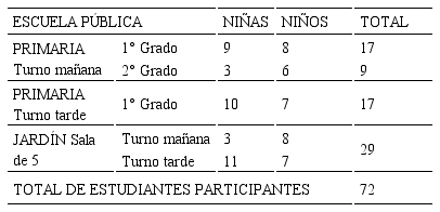 Durante los meses de septiembre y octubre del año 2016 participaron en las actividades un total de 316 alumnos provenientes de nivel inicial (salas de 4 y 5 años) y de nivel primario (1° y 2° grado) de las escuelas privada (Tabla1) y pública (Tabla 2).