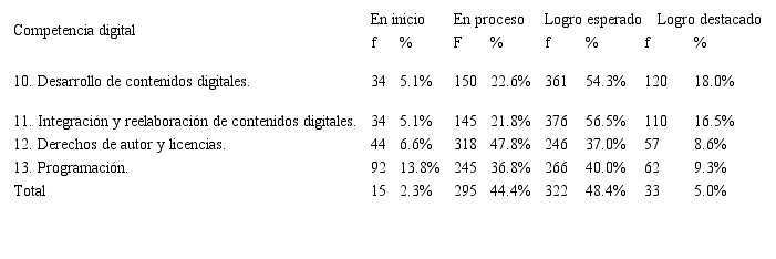 En cuanto al área de competencia digital creación de contenidos digitales, prevalece un logro en proceso en la competencia de derechos de autor y licencias; y en las competencias desarrollo de contenidos digitales, integración y reelaboración de contenidos digitales, y programación prevalece el nivel de logro esperado.