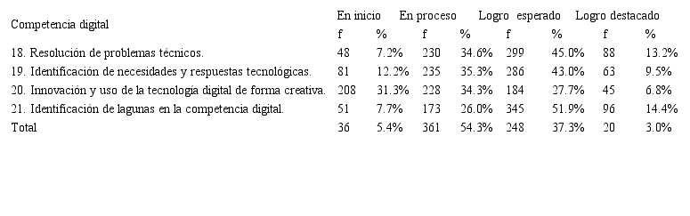 Del área de competencia digital resolución de problemas, en la competencia innovación y uso de la tecnología digital de forma creativa muestra logro en proceso, y en las competencias de resolución de problemas técnicos, identificación de necesidades y respuestas tecnológicas e identificación de lagunas en la competencia digital alcanzó un logro esperado.
