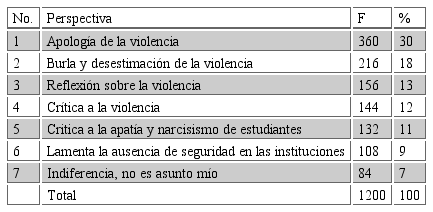 El análisis temático de las publicaciones online, revela que ante un episodio de violencia se presentan reacciones heterogéneas, diferenciando siete perspectivas en la comunidad de espectadores. Desde la indiferencia a la apología de la violencia, pasando por las críticas a las instituciones (crítica a la escuela, a la policía) y las críticas a sus contemporáneos; así como los que se burlan y desestiman la violencia además de los que reflexionan sobre ella e invitan a la prudencia y a permanecer alerta. La violencia, sin duda, despierta una amplia recepción estética, donde sobresale su banalización. En la siguiente tabla se muestran las perspectivas estudiantiles y los porcentajes, en orden descendente.