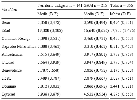 En los territorios indígenas el porcentaje de hombres fue 65%, en contraste con el GAM, donde la mayoría del estudiantado que participó en la muestra eran mujeres (58.6%). En cuanto a las estadísticas descriptivas de las variables incluidas en el modelo multivariado, en la Tabla 1 se resumen los datos por región y total.