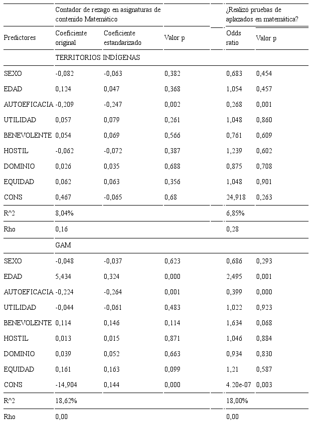 En cuanto a las dos variables sociodemográficas, sexo y edad, la evidencia mostrada en la Tabla 2 apunta a que la edad, en el GAM y, como era de esperar, representa una variable de control muy relevante, dado que está asociada con los indicadores de rezago, tanto para la variable métrica, como para la variable dicotómica. Por otra parte, en ninguna de las dos poblaciones se presentaron diferencias de relevancia en cuanto al sexo. Este resultado contradice hallazgos de investigaciones en torno a menores rendimientos para las mujeres en matemática. Se prefiere no especular sobre posibles razones para este comportamiento específico en estas muestras.