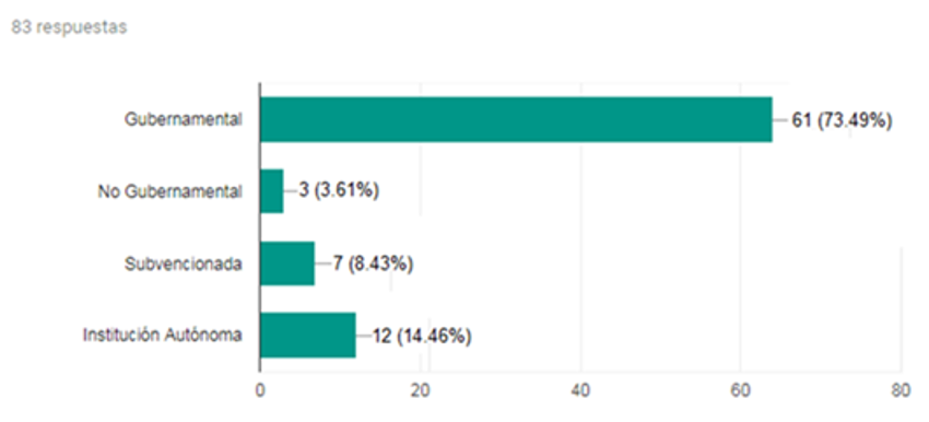 Es decir, la mayoría de las personas encuestadas se desempeñan en educación primaria, secundaria y una minoría en educación superior, tales como, en la Universidad de Costa Rica, Universidad Técnica Nacional, Universidad Estatal a Distancia y la Universidad Nacional. Además, de otras instituciones gubernamentales, tales como el Patronato Nacional de la Infancia, Instituto Nacional de Aprendizaje y el Ministerio de Justicia y Paz.