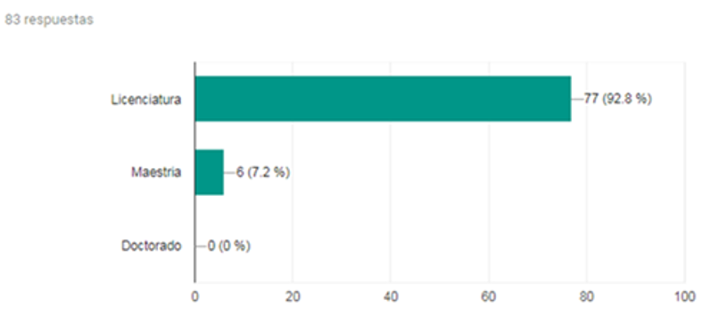 En cuanto al grado académico, según el Gráfico 3, la mayoría de las personas profesionales participantes en este estudio, poseen licenciatura con un 92,80%, seguido de la maestría con un 7,20% y ninguna de las personas encuestadas señaló tener el posgrado de doctorado.