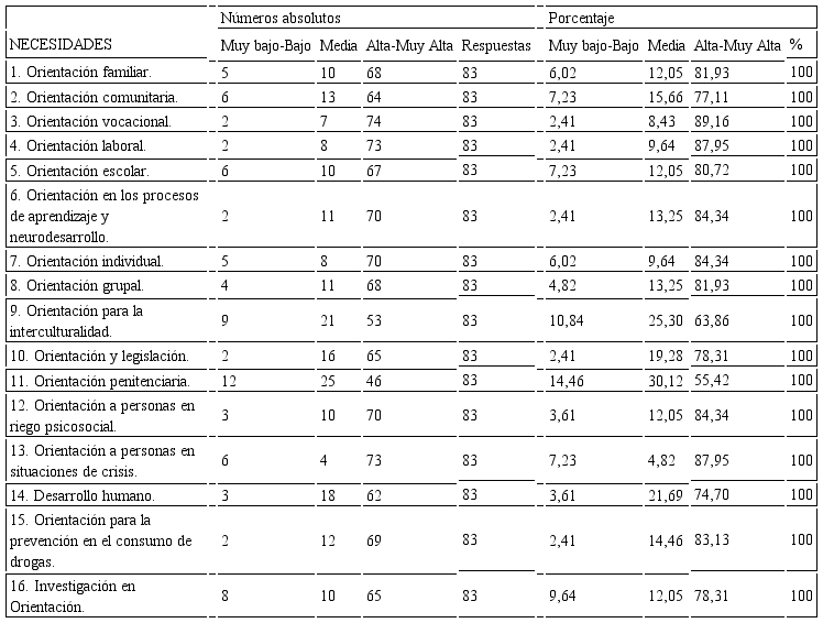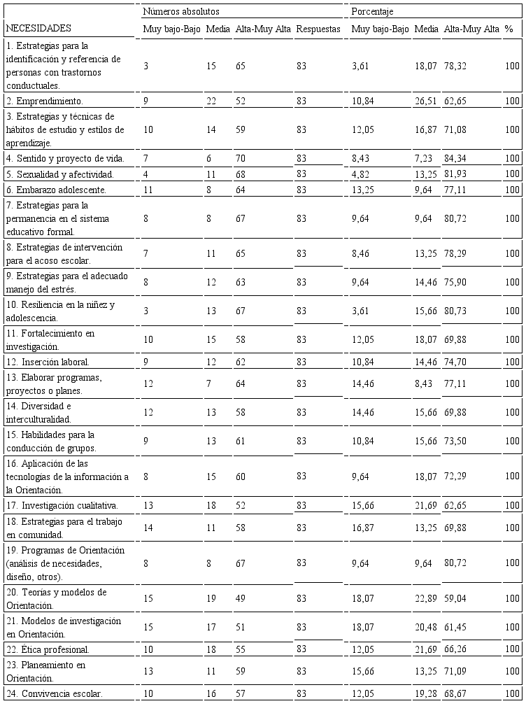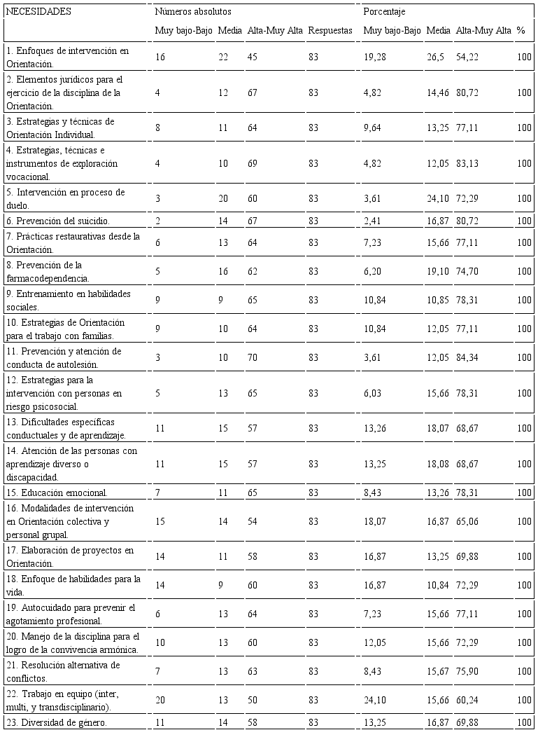 De acuerdo con la Tabla 1, los resultados indican que las personas profesionales en Orientación, valoran los siguientes tópicos como los más importantes: con un 84,34%, la prevención y atención de la conducta de autolesión; un 83,13% estrategias, técnicas e instrumentos de exploración vocacional; un 80,72% prevención del suicidio, un 80,72% elementos jurídicos para el ejercicio de la disciplina de la Orientación y con 78,31 están: la intervención de personas en riesgo psicosocial, educación emocional y entrenamiento en habilidades sociales. Cabe destacar que las temáticas anteriores fueron consideradas con una importancia entre alta y muy alta.