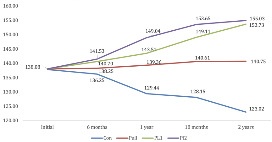 El grupo control disminuyó un total de 15.02 puntos de CI (10,7%) en este periodo, mientras que los grupos en enfoques diferenciados aumentaron sus puntajes en 2.64 puntos (1,91%), para pullout o modelo extraescolar 15.65 (11,34%) P1 enfoque diferenciado a tiempo completo, y 16.9 (12,2%) para el P2 programa intensivo. La mayor diferencia en los puntajes al finalizar el periodo de dos años fue entre el grupo control y pullout, con 16 puntos de diferencia en el CI promedio de sus grupos.