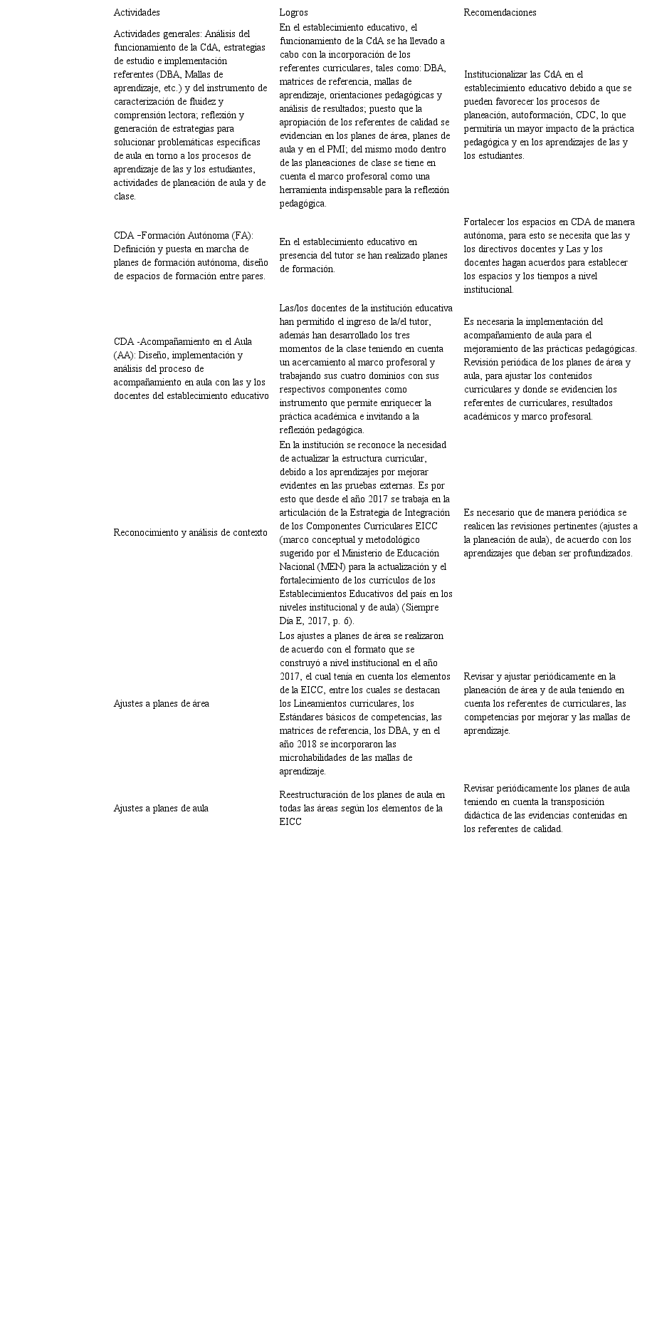 Ahora bien, la reflexión pedagógica es un constructo individual que no se alcanza únicamente con el acompañamiento situado, es necesario que la persona docente esté motivada para mejorar sus procesos de enseñanza y sobre todo a cualificarlos a partir de los ámbitos que involucra el marco para la enseñanza. De acuerdo con lo anterior se plantean las siguientes recomendaciones para el establecimiento educativo (ver Tabla 3).