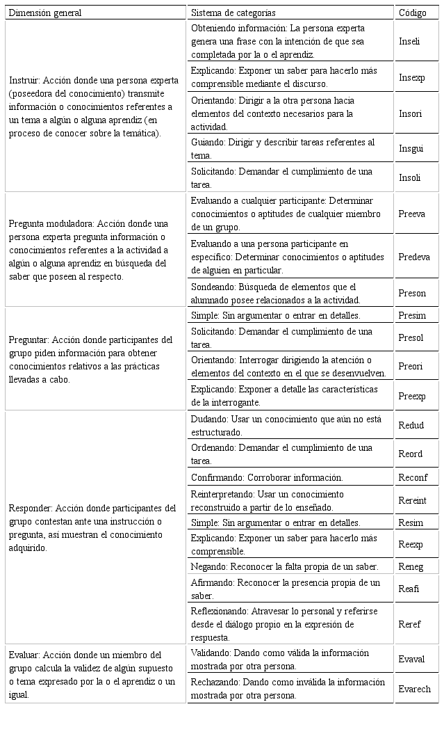 La codificación fue generada con base en el sistema de categorización propuesto por Ruiz, Engrandes y Cruz (2019), adaptada al contexto de observación y los objetivos del estudio, esta se observa en la Tabla 1 y Tabla 2: