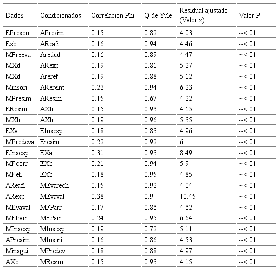 A partir de la información obtenida de las secuencias codificadas, se recolectaron en total 754 eventos discursivos de las tres clases de medicina, los cuales se emplearon como datos a analizar mediante el programa SDIS-GSEQ. De dicho análisis se obtuvieron las asociaciones entre las categorías discursivas, de las que se tomó en consideración aquellas con: ajuste residual z mayor a 2.54, valor de error (p) menor o igual a 0.01, y una correlación (coeficiente Phi) mayor o igual a 0.15. Los valores de aceptación en las pruebas mencionadas tienen la intención de reportar con validez las secuencias discursivas recolectadas durante el estudio, con un nivel de confianza por arriba del 95%. Los resultados se muestran en la Tabla 3.