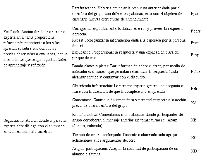 Ambos son elementos importantes dentro del patrón discursivo y, a diferencia de lo mencionado por Liu, (2008) y Miao y Heining-Boynton (2001), más que la retroalimentación sustituya al seguimiento, en ocasiones puede ser un complemento, ya que aprovecha el conocimiento para continuar la práctica y que esta sea más efectiva.