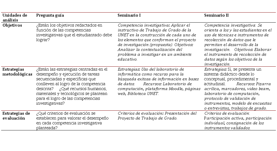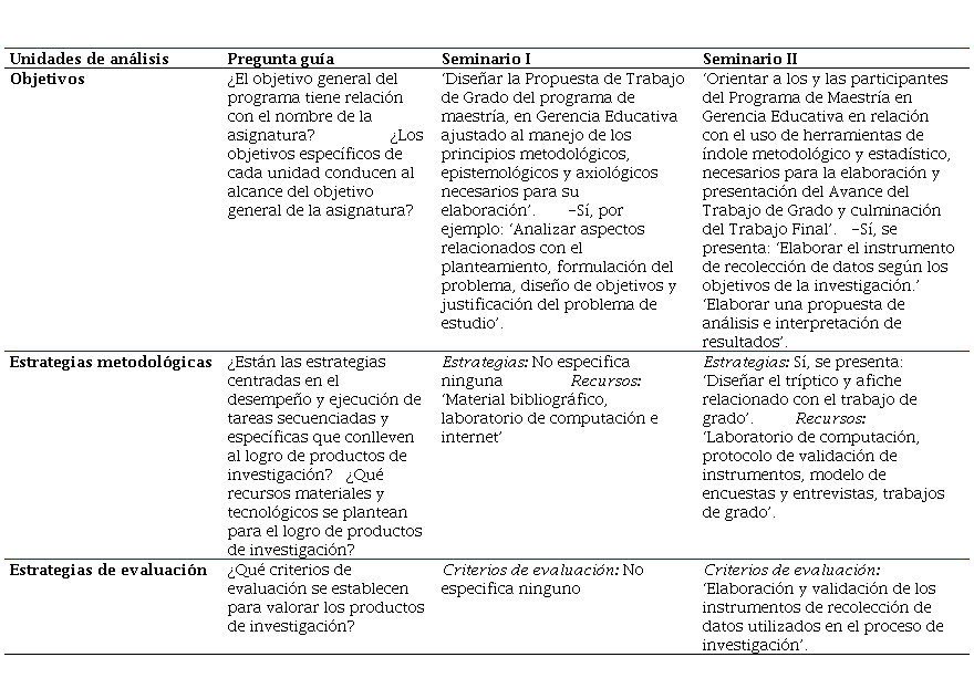 Luego de la revisión de los programas para el caso del Seminario I, se pudo observar que, en relación con la coherencia externa, no se especificó el logro de las competencias investigativas en los objetivos. Para el caso del Seminario II, este estaba orientado hacia la elaboración y presentación del avance del trabajo de grado, y en la elaboración de una propuesta e interpretación de resultados. Sin embargo, no se precisa la manera de cómo formar una persona investigadora, con posibilidades de autorrealización mediante el trabajo creativo, que promueva la internacionalización del método científico y de sus posibilidades de aplicación en su alumnado, como parte fundamental de su acción educativa. En cuanto a la descripción de las estrategias metodológicas, estas estaban centradas en la elaboración y exposición de los diversos componentes de la propuesta de trabajo de grado en el Seminario I. Para el caso del Seminario II, se incluyeron ejercicios prácticos sobre la elaboración de resúmenes, introducción, conclusiones y recomendaciones. Con respecto al Seminario I, coinciden en el uso de los recursos tanto tradicionales como tecnológicos, por ejemplo: Material bibliográfico, pizarra acrílica y marcadores, laboratorio de computación, video beam, internet. Mientras que en el Seminario II, se describió el uso del laboratorio de computación, el protocolo de validación de instrumentos, modelo de encuestas y entrevistas, y trabajos de grado., que coincidió con el del programa Gerencia Educativa, aunque no precisa a quién se le aplicaría los instrumentos de investigación. Los criterios de evaluación se centraron en el Seminario I en torno a las destrezas conceptuales, teóricas y prácticas, relacionadas con los diversos componentes de la propuesta de trabajo de grado. Para el Seminario II, los aspectos que destacaron fueron: participación activa, participación individual y consignación de los instrumentos validados; no se evidencia criterios e indicadores para valorar el logro de las competencias investigativas. No se visualiza la manera de cómo se planteará la forma de conocer a fondo la realidad a estudiar para solucionar un problema de investigación.